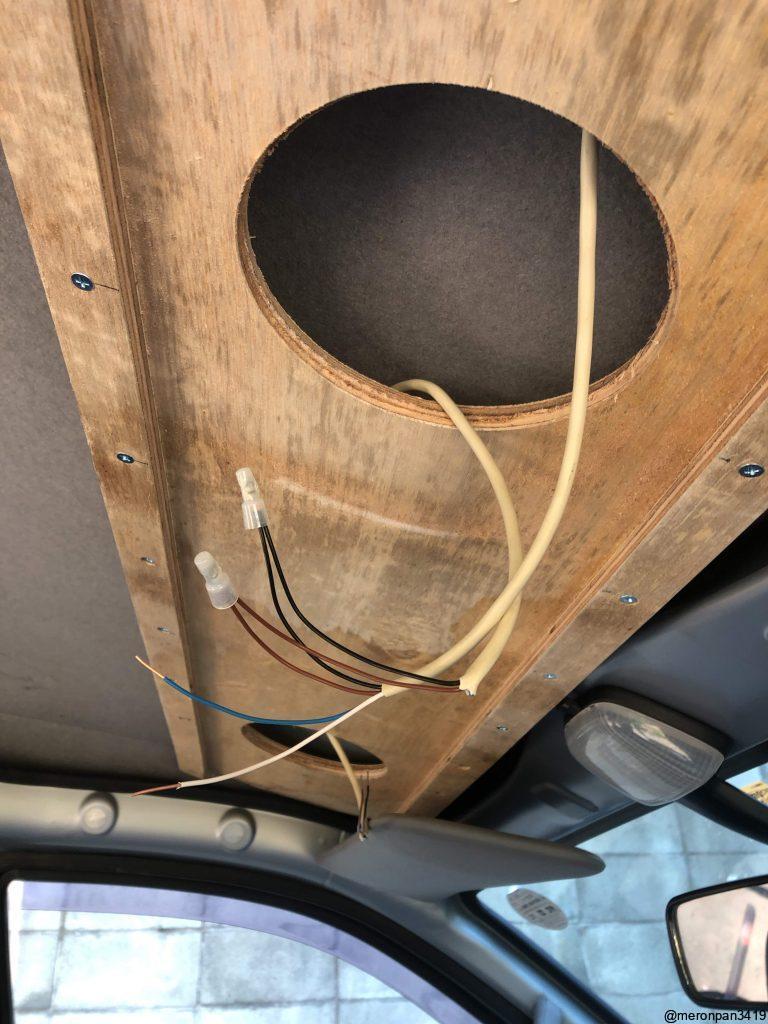 ハイゼットカーゴのスピーカーがハンドル下にRだけのモノナルだったので、家に転がっていたものを使って天井にスピーカー取付しました。