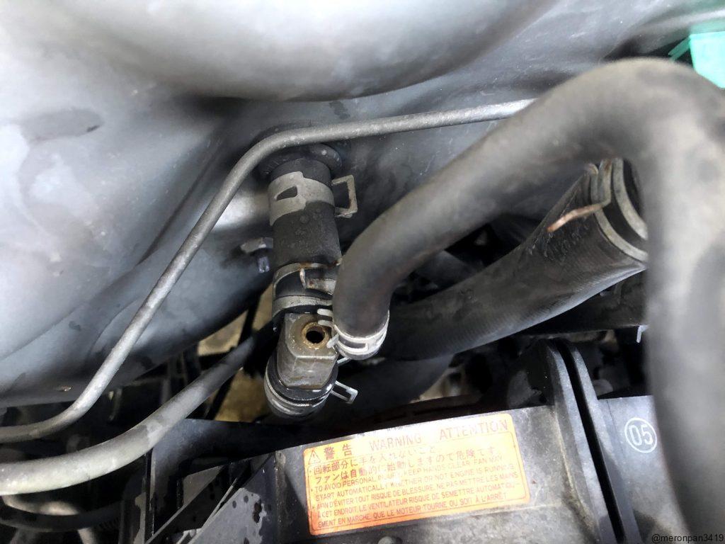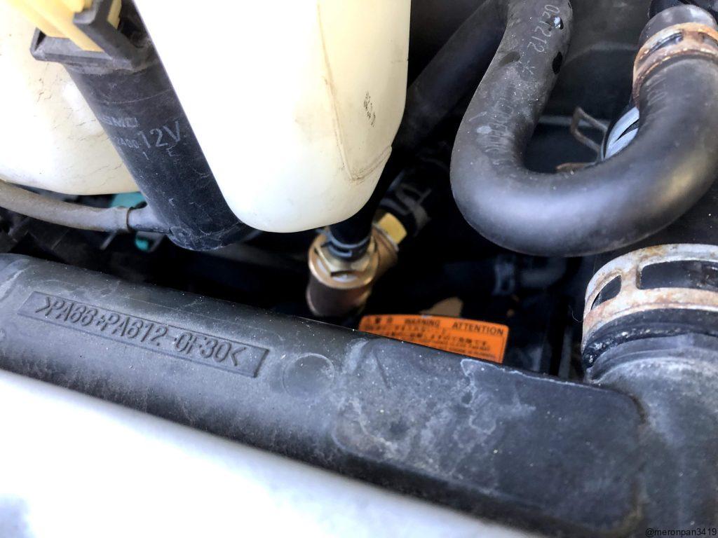 作業スペースが狭いので、ラジエーターから出てる配管とウォーシャー液のタンクも一度外して無理やりねじ込んでます。